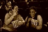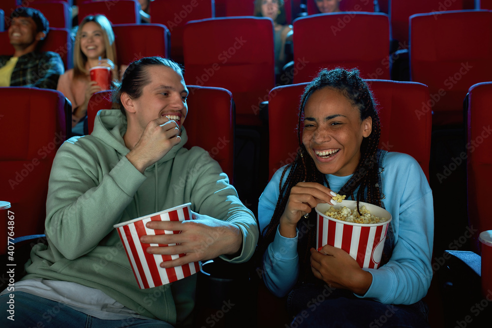 Happy young couple laughing, having popcorn while watching movie together, sitting in cinema auditorium