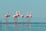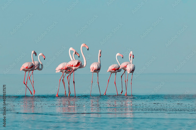 Wild african birds. Group birds of pink african flamingos walking around the blue lagoon