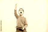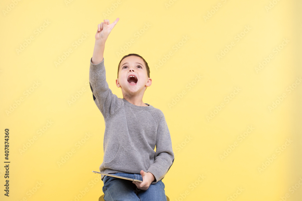 Caucasian child has an idea. Hand gesture, forefinger up. Emotional face. Smart child, early development, bright idea concept. Yellow background, gray sweater. Copy space.