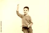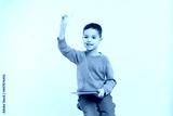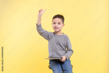Caucasian child with a tablet has a brilliant idea. Hand gesture, forefinger up. Expressive face. Open mouth. Smart kid, joy to learn, technology innovation concept. Copy space. Yellow background.