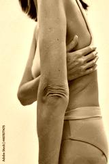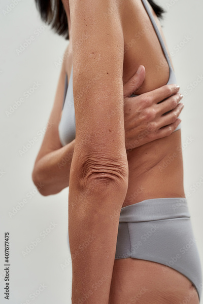 Love your body. Vertical cropped shot of a senior woman in lingerie hugging herself while posing isolated over grey background, side view