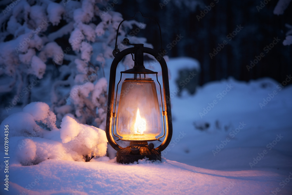 Burning vintage lantern in winter night forest. Beautiful winter background.