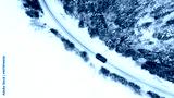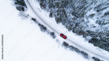 Aerial top view of snow covered forest and lake with winter road and red car. Drone photography landscape.