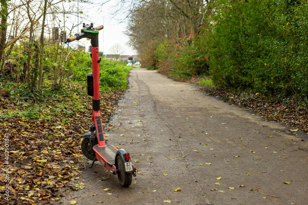 Battery powered electric scooter vehicle left on pedestrian footpath in england uk