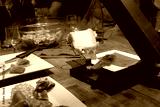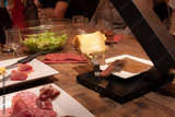 Traditional raclette dinner at a restaurant, scraping melted cheese onto a plate served with cooked potatoes, hams and salad