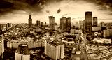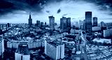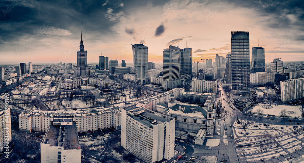 Beautiful panoramic aerial drone view on All Saints Church - Roman Catholic church located at Grzybowski Square, Warsaw City Skyscrapers, PKiN, and Varso Tower under construction. Warsaw, Poland