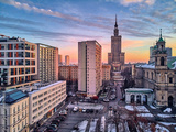 Beautiful panoramic aerial drone view on All Saints Church - Roman Catholic church located at Grzybowski Square, Warsaw City Skyscrapers, PKiN, and Varso Tower under construction. Warsaw, Poland