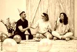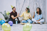 Funny hipster guy in cone hat giving five girl playing game for winning sweets satisfied with great birthday party,happy male and female guests sitting on floor on festive decorations enjoying holiday