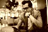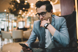 Thoughtful man messaging on smartphone in restaurant
