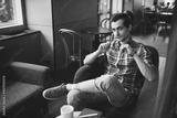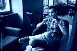 Young positive man with notebook sitting in armchair in cozy coffee shop