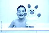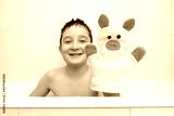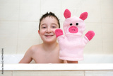 A boy in a bathroom showing funny piggy hand puppet toy washcloth close up, happy washing and shower concept
