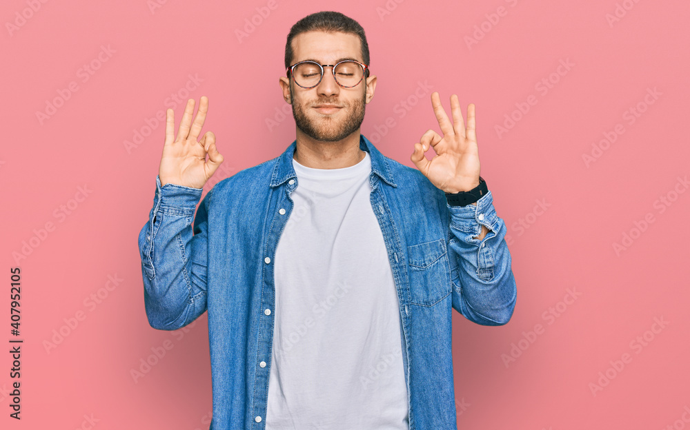 Young caucasian man wearing casual clothes relaxed and smiling with eyes closed doing meditation gesture with fingers. yoga concept.