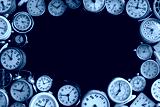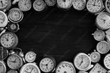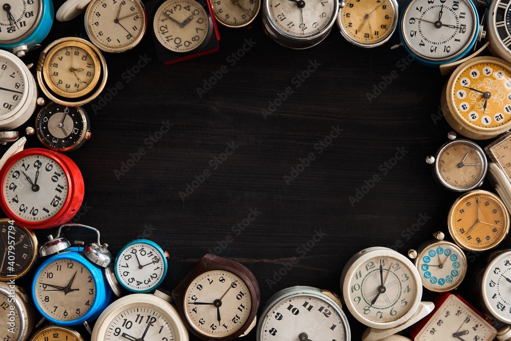 many old clocks on a dark wooden surface .