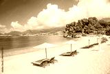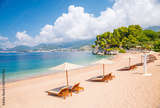 Beautiful beach near Sveti Stefan island. Location place of Montenegro, Europe.