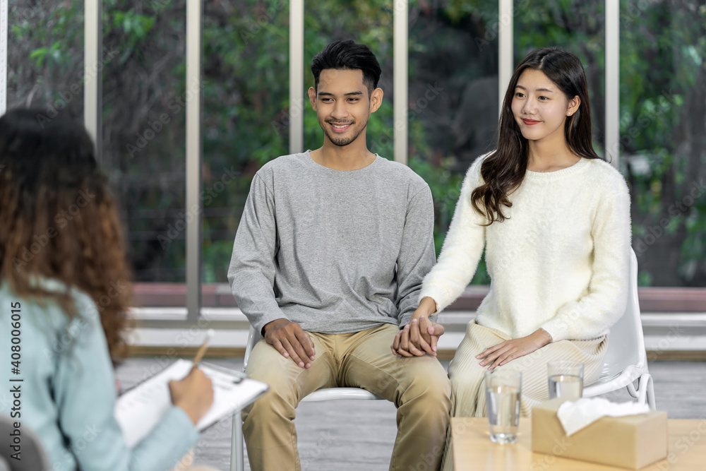 Rear side of coaching take noted and giving consult to Asian lover take happiness action after psychologist therapy session success, Psychologist couple and hypnosis,life coach and coaching concept