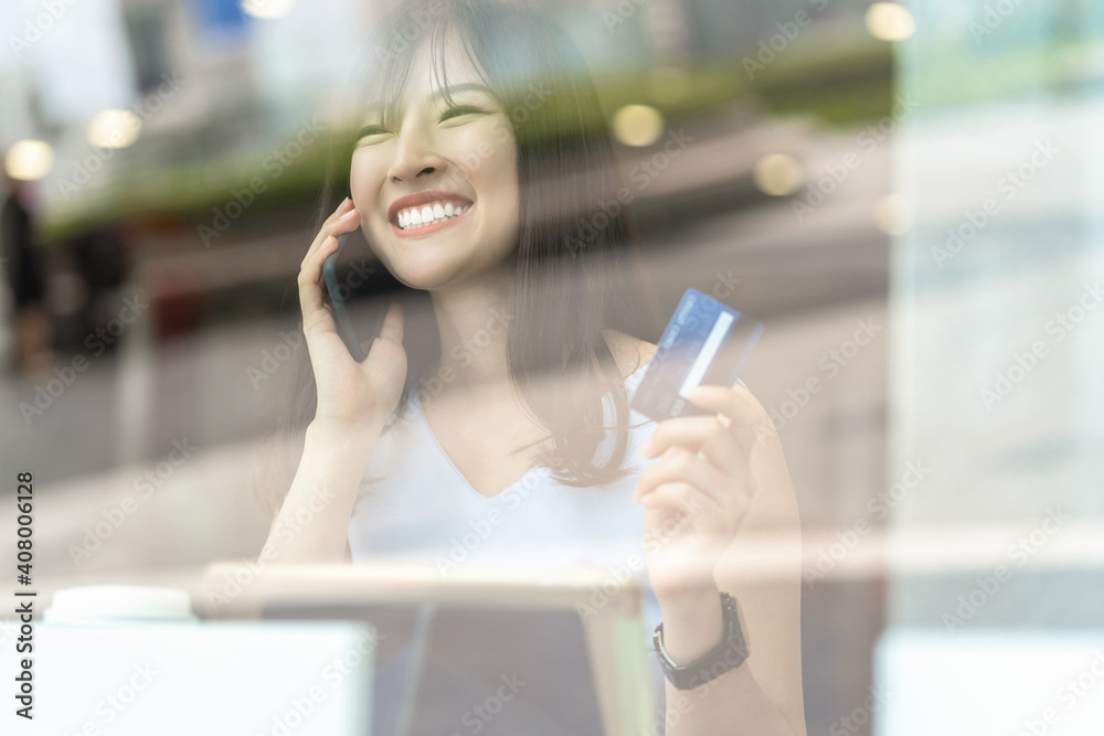 Asian woman using credit card with mobile phone for online shopping in modern coffee shop, technology money wallet and online payment concept, credit card mockup