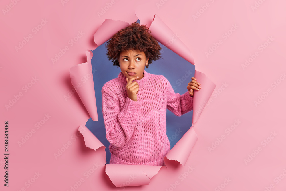 Photo of thoughtful dark skinned woman holds chin and concentrated somewhere tries to gather with thoughts wears knitted sweater breaks through paper background stands in hole with ripped sides