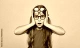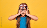 Cute girl with surprised emotions wearing many stylish eyeglasses on yellow background. Kids, vision correction