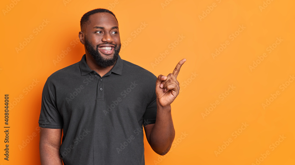 Photo of happy bearded young Afro American man points right with index finger shows awesome copy space against orange studio background dressed casually suggests good offer. Advertisement concept