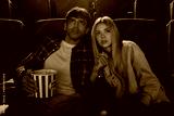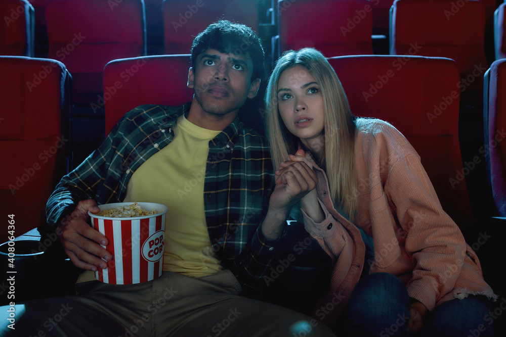 Focused young couple, attractive man and woman sitting at the cinema, watching a movie with enthusiasm and holding hands