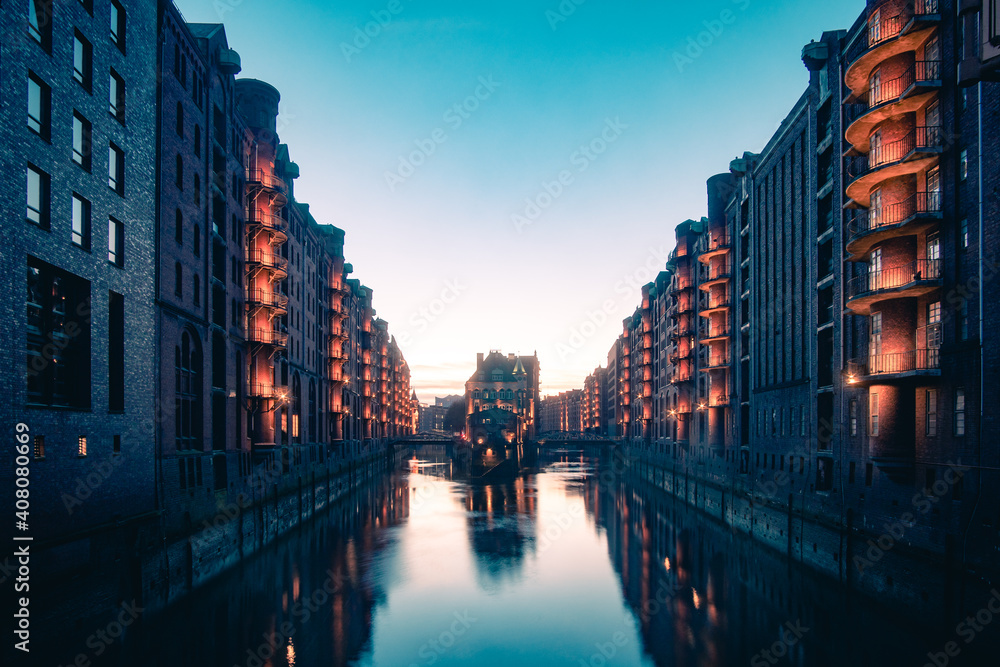 Hamburg - View to the illuminated moated castle at Blue Hour, which has been built at 1907, Hamburg Speicherstadt, Hamburg, Germany, Hamburg, December 2020