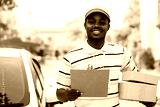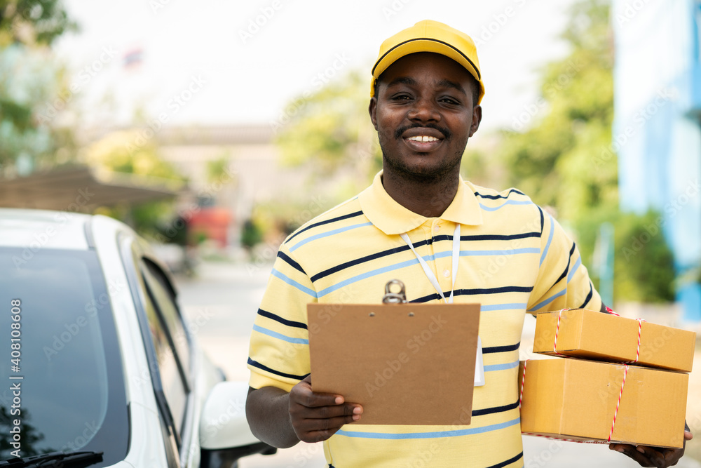 African male postal delivery courier man holding delivering package boxs and cardboard in front of car