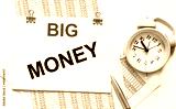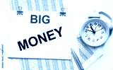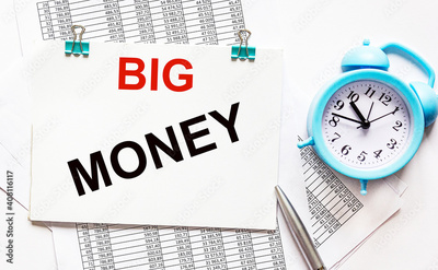The text Big Money is written on a note that lies on the accounting documents and a white background. Nearby a pen and an alarm clock