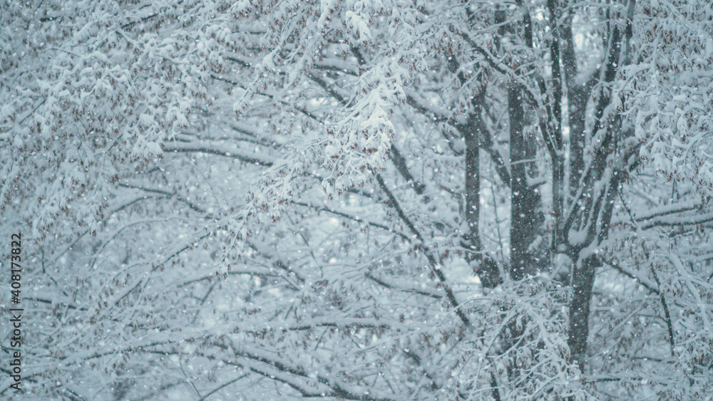 CLOSE UP, DOF: Scenic shot of snow covering the bare treetops during a blizzard.