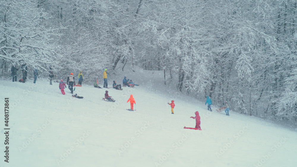 Scenic shot of carefree kids and adults sleighing during a heavy snowstorm.