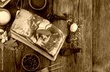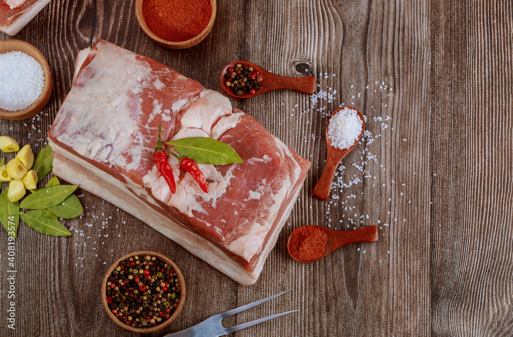 Top view of piece of raw pork belly with salt and red paprika on wooden table.