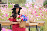 happy asian woman in the flower garden and relaxing on holiday