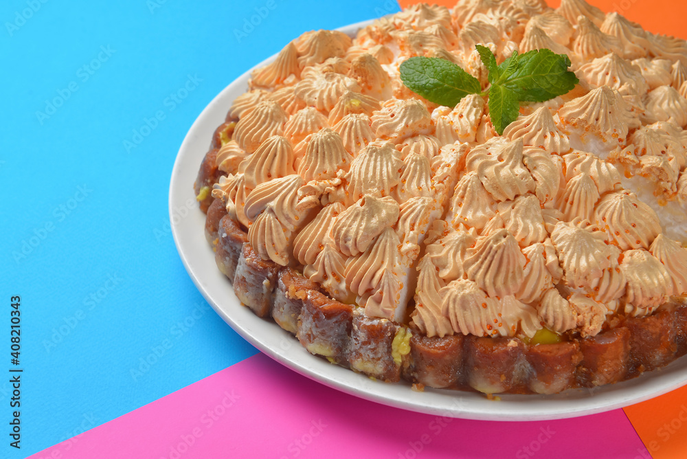 Lemon cake with whipped cream on top, whole cut lemon tart over colorful background.