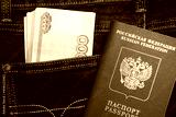 A stack of Russian thousand-ruble bills in a pocket of blue jeans and a Russian international passport. Money in your pocket, cash. Travel concept.
