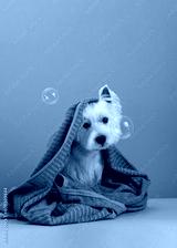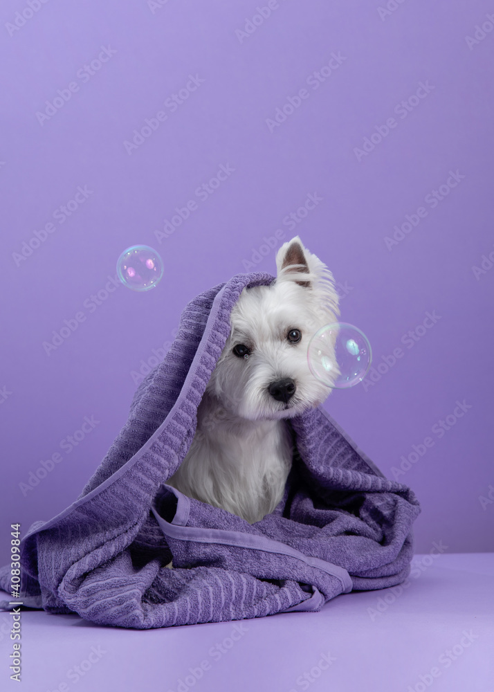 Cute West Highland White Terrier dog on purple background after bath. Dog wrapped in a towel among soap bubbles. Pet grooming concept. Copy Space. Place for text