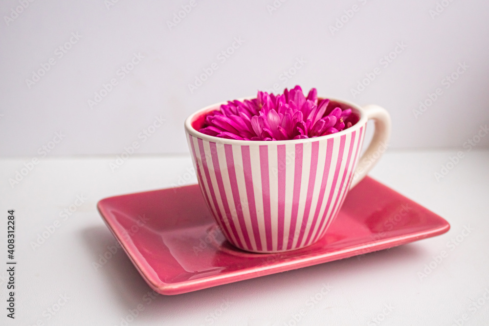 Bright bud pink chrysanthemums in a small cup with a saucer