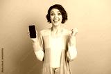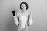 Photo portrait of cheerful girl celebrating holding phone with blank space in one hand isolated on pastel blue colored background