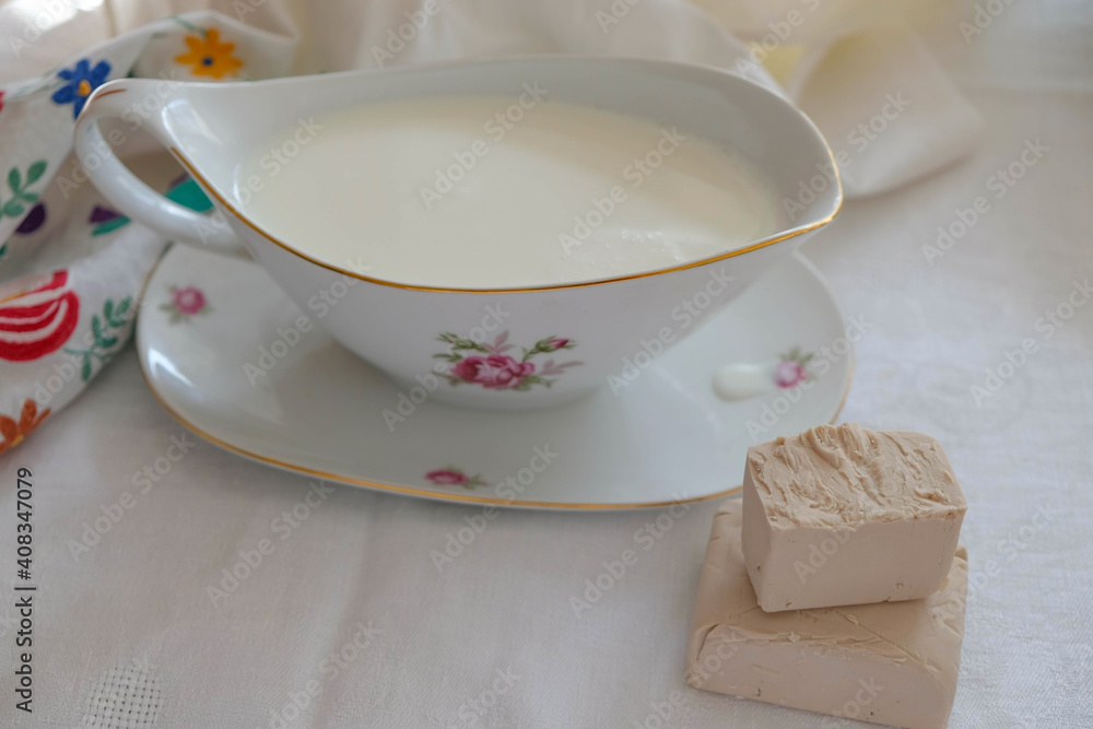 Fresh yeast and milk for Easter baking on the rustic kitchen table. Morning light.