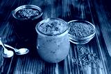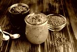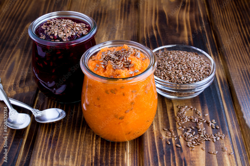 Vegetable smoothies or puree with flax seeds in the glass jars on the wooden surface