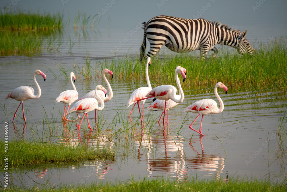 Lesser Pink Flamingos and Zebra are Grazing in the Lake in Ngorongoro Conservation Area in Tanzania, Africa