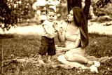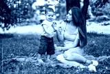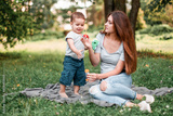 Mother with son blowing soap bubbles in the park.