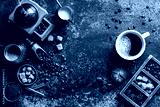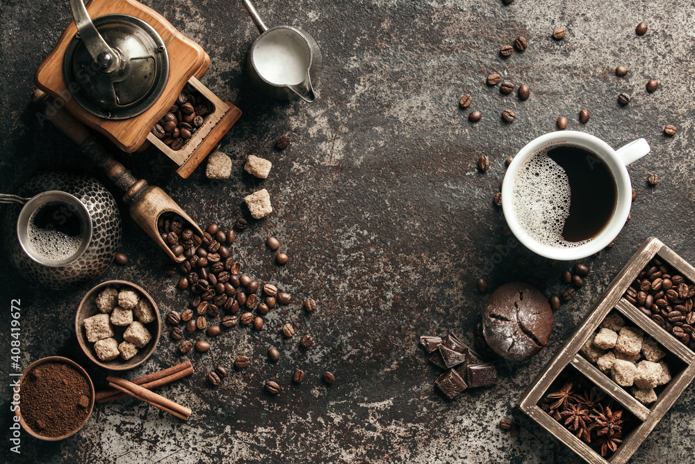 Coffee cup with coffee grinder and coffee beans on dark textured background.