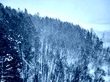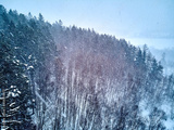 Beautiful panoramic aerial drone view on a winter landscape in the Stolowe mountains during a snowfall. The Stolowe Mountains National Park, Poland, Europe