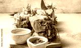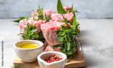 Pork Osso Buco, shin Pork shanks with fresh aromatic herbs on white marmol board