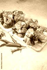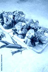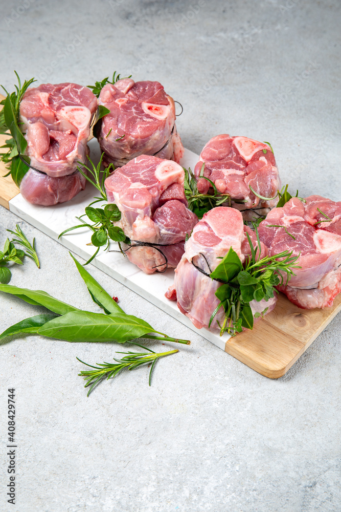 Pork Osso Buco, shin Pork shanks with fresh aromatic herbs on white marmol board