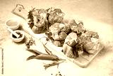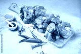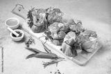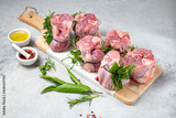 Pork Osso Buco, shin Pork shanks with fresh aromatic herbs on white marmol board