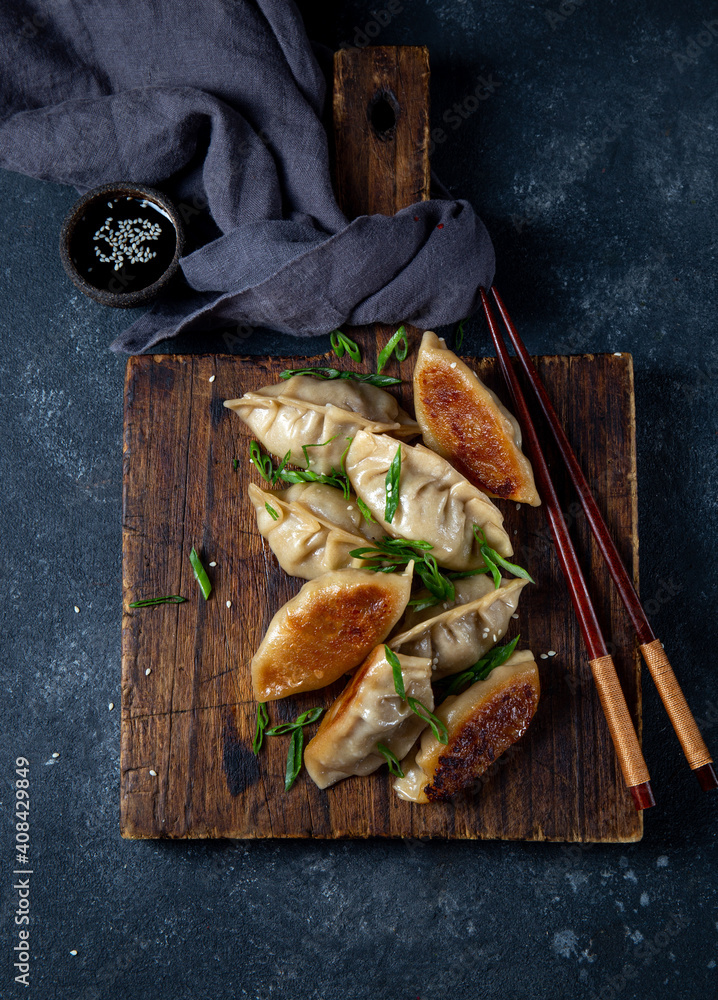 Asian dumplings Gyoza potstickers on old wooden board. Top view, copy space