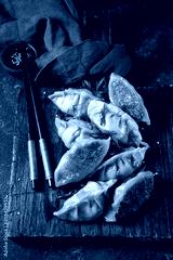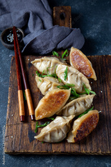 Asian dumplings Gyoza potstickers on old wooden board. Top view, copy space