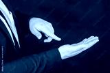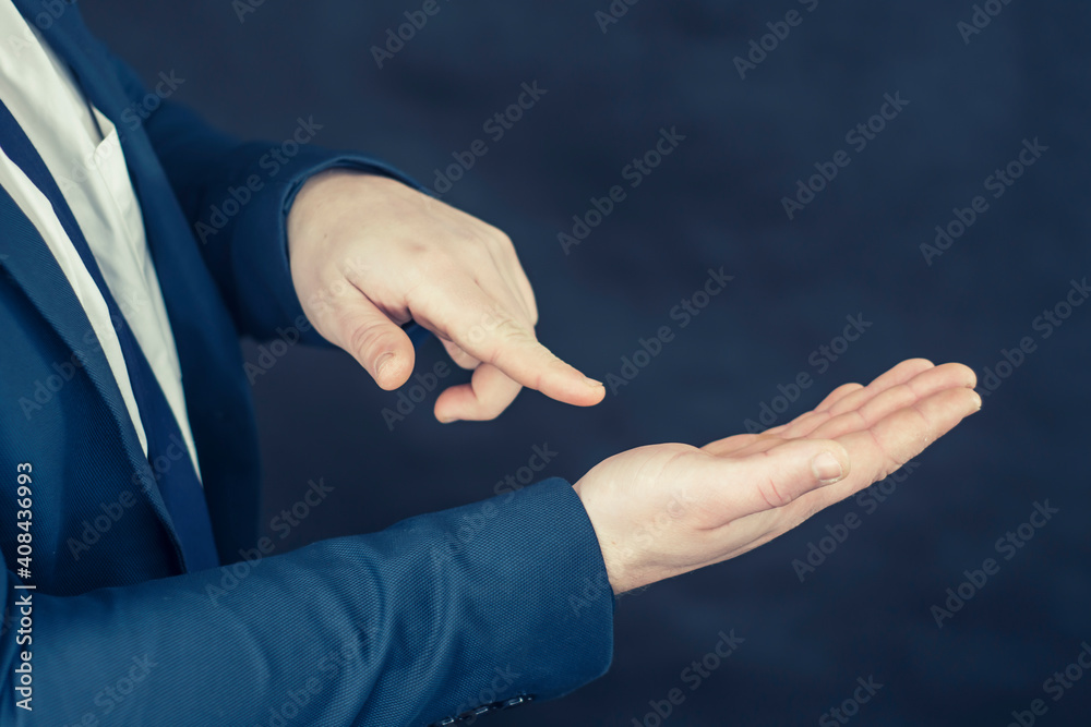 Businessman in a shirt and a blue jacket shows gestures with his hands.
