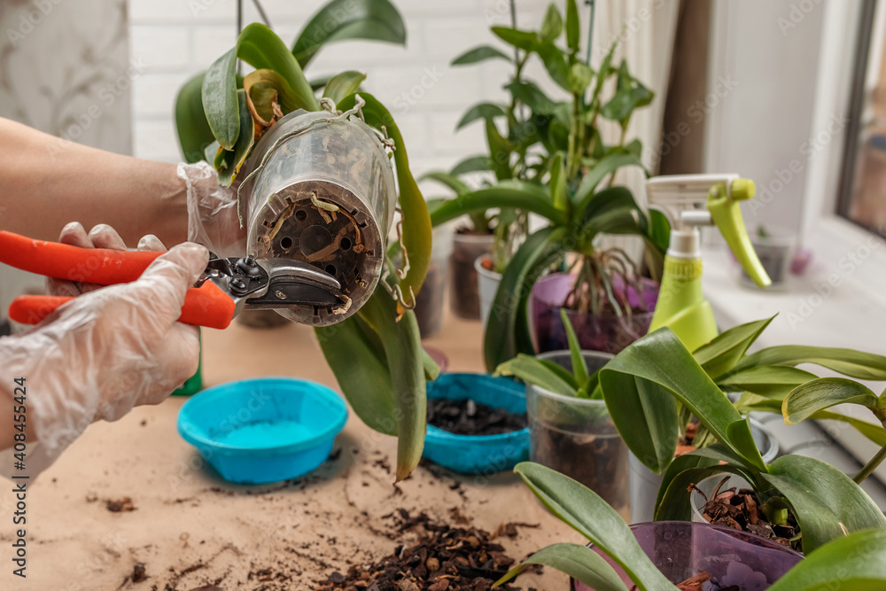Women's gloved hands prune and transplant indoor orchid plants, at home. Spring care of the home garden. selective focus