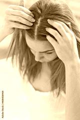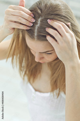 Young woman with hair loss problem on white background, closeup. Woman hair problem. High quality photo